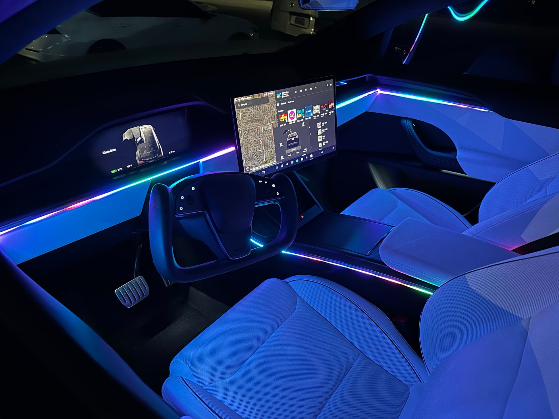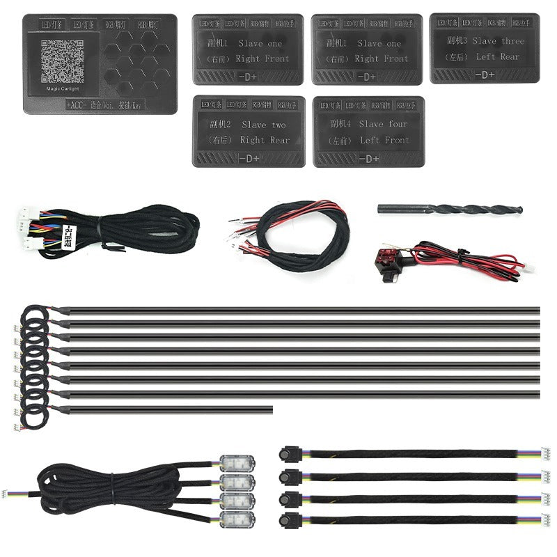 - Included: 7 led strips (43.4"), 1 led strip ((39.3), 4 footwell lights, 4 bowl lights, 4 door handle lights, 1 master controller, 5 sub controllers, fuse tape, drill bit